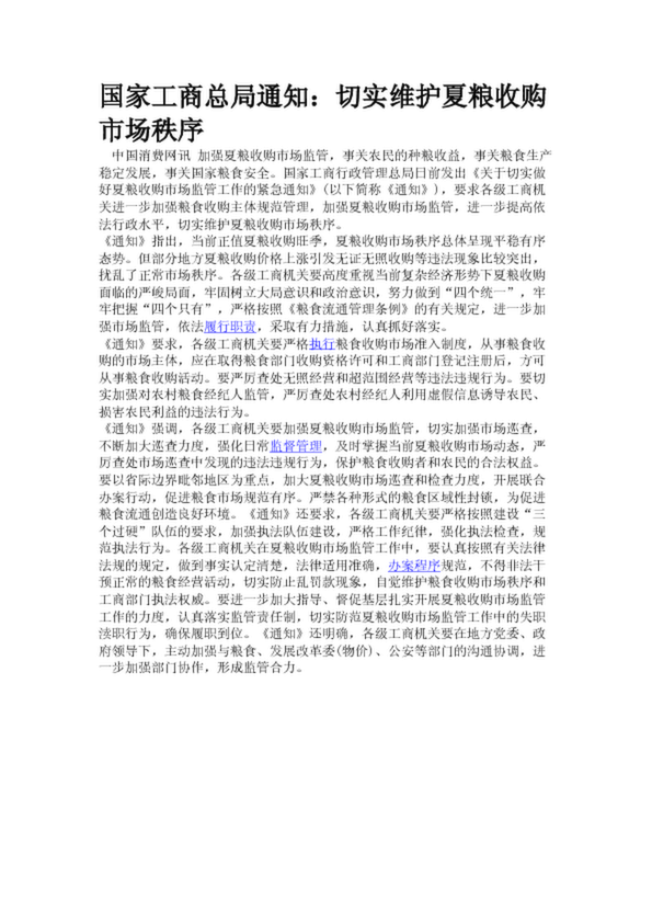 國家工商總局通知:切實(shí)維護(hù)夏糧收購市場(chǎng)秩序