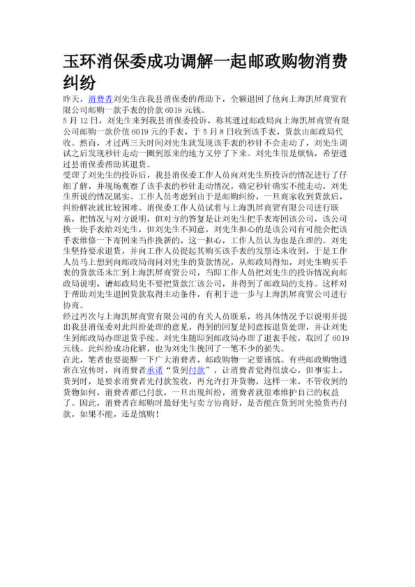 玉環(huán)消保委成功調(diào)解一起郵政購(gòu)物消費(fèi)糾紛