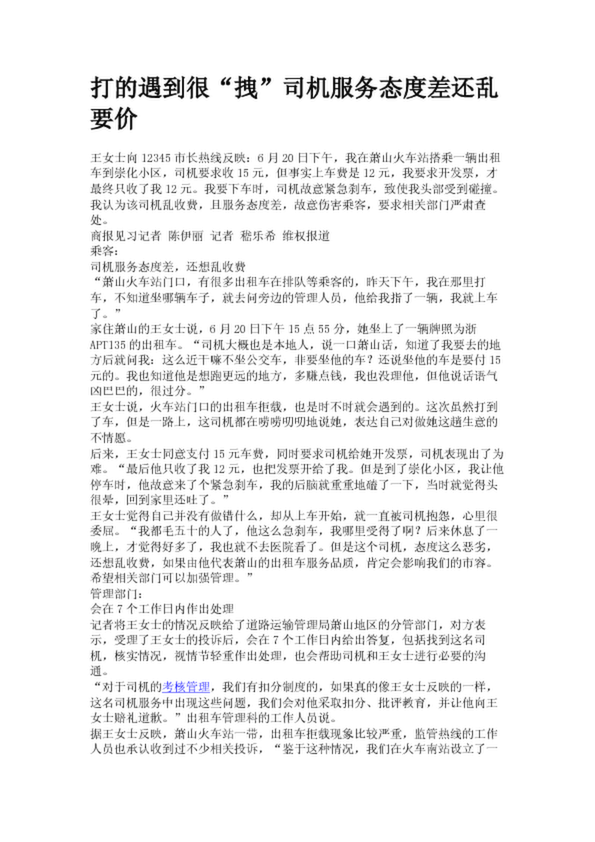 打的遇到很“拽”司機服務態(tài)度差還亂要價(21.84KB)