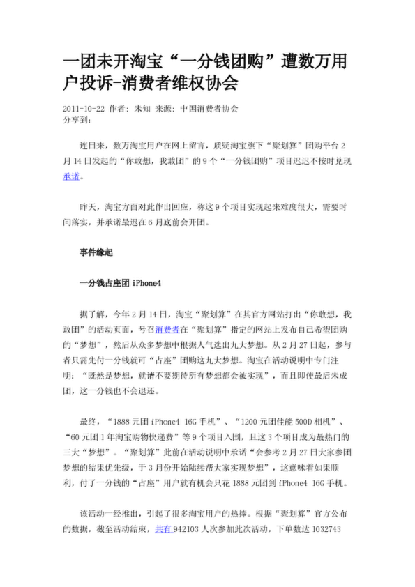 一團未開淘寶“一分錢團購”遭數(shù)萬用戶投訴-消費者維權(quán)協(xié)會