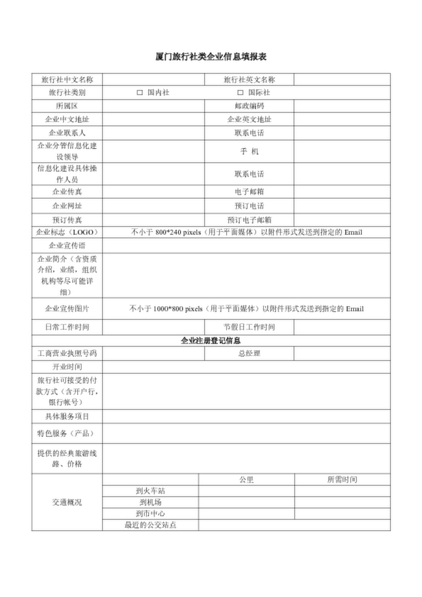 廈門旅行社類企業(yè)信息填報(bào)表,旅行社名稱: 許可證號(hào)碼: 旅行社簡(jiǎn)介: 許可經(jīng)營(yíng)業(yè)務(wù)(入境旅游業(yè)務(wù)、國(guó)內(nèi)旅游業(yè)務(wù)、出境旅游業(yè)務(wù)、特許經(jīng)營(yíng)中國(guó)公民自費(fèi)旅游業(yè)務(wù)):