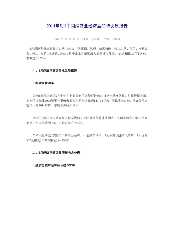 2014年5月中國酒店業(yè)經濟型品牌發(fā)展報告