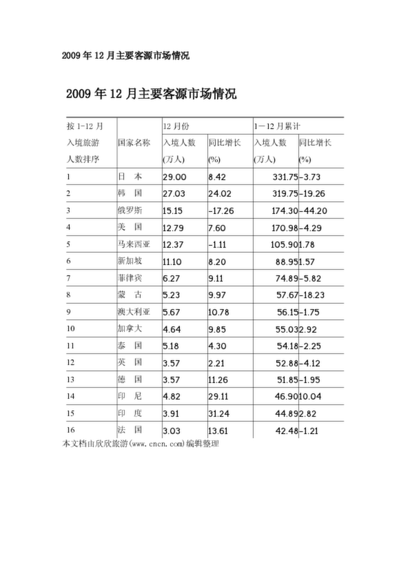 2009年12月主要客源市場(chǎng)情況(37.46KB)