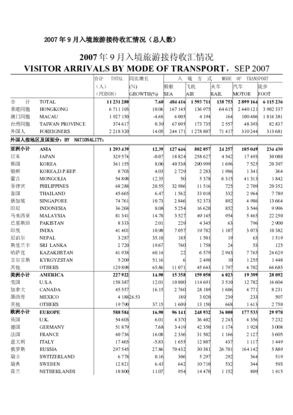 2007年9月入境旅游接待收匯情況(總?cè)藬?shù))