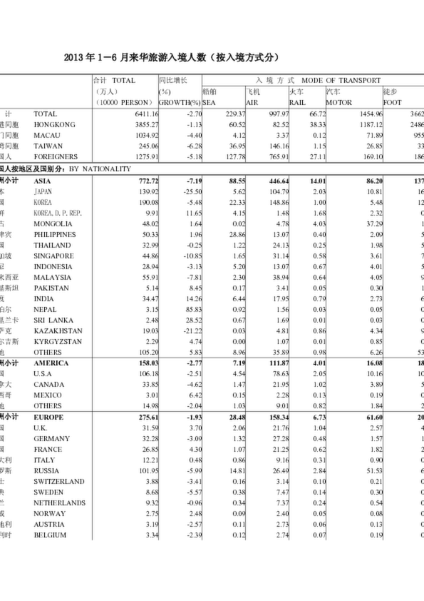 2013年1-6月來華旅游入境人數(shù)(按入境方式分)(0.11MB)