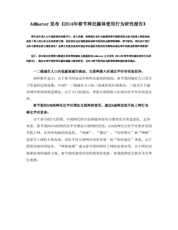 AdMaster發(fā)布《2014年春節(jié)網(wǎng)民媒體使用行為研究報(bào)告》(0.31MB)