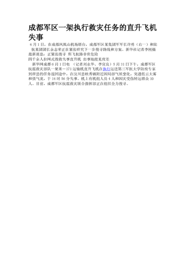 成都軍區(qū)一架執(zhí)行救災任務的直升飛機失事