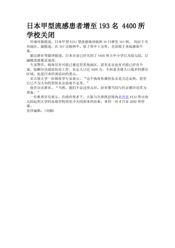 日本甲型流感患者增至193名 4400所學校關閉